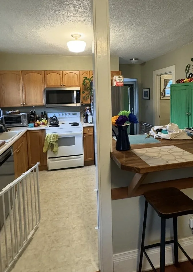 The home features custom built, wood cabinetry through-out with soft-close drawers, hinges and adjustable shelving. Cabinet fronts are built from locally sourced, high quality walnut veneered plywood adorned with hand-made 10" solid walnut hardware. The upper cabinets in the kitchen are built with premium beech wood, painted with highest quality Evolution Series cabinet paint from Miller Paint, finished with antique solid brass cabinet knobs sourced locally in Portland. The kitchen features a beautiful moss green porcelain tile backsplash along with a subtle gold veined quartz countertop, floor to-ceiling pantry, custom range hood, brand-new energy efficient stainless-steel appliances, restored olive green millwork, custom solid maple open shelving, and glazed porcelain floor tile that gives the feel and appearance of natural clay terracotta. The central light fixture adds personality and function with a 3-arm, solid brass fixture with globe light shades. The dining area features pendant accent lighting custom made from antique chandelier copper light shades with a scalloped edge and industrial light bulbs. The dining area also features handmade barstools built from reclaimed lumber.